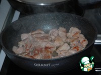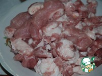 Удаляем прожилки, пленки, косточки. Нарезаем мясо крупными брусочками шириной 1,5 см длиной 2-2,5 см. Небольшое количество жира будет нелишним оставить. |