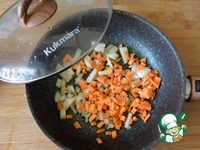 Берём сковороду от Kukmara. Наливаем масло. В этой сковроде можно жарить при минимуме масла, и еда не пригорит. Нагреваем, кладём порезанные лук и морковь, обжариваем на среднем оне 2 минуты. |