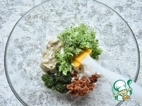 После того как капуста остынет добавляю в нее яйца, натертый пармезан, измельченный лук и чеснок, паприку, черный молотый перец, муку и цедру лимона |