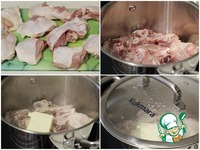 Курицу разделать на порционные куски (у меня в этот раз только бёдрышки, но из тушки вкуснее получается), сложить их в кастрюлю с толстым дном. Я готовила в кастрюле серии Leon от Кукмара.
