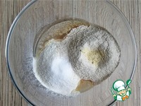 Всыпать всю муку, разрыхлитель и сушеный чеснок. |