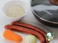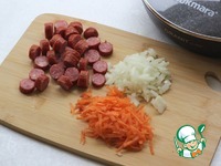 Натрите морковь на терке, нарежьте лук. Колбаски нарежьте небольшими кружочками. |