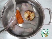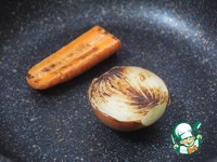 Лук не очищать от шелухи, вымыть, вытереть насухо. Очистить и вымыть морковь. Подпалить половину луковицы и моркови на сильном огне разрезом вниз на сковороде без масла. |