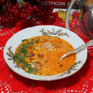 Фасоль и кукурузу отцедить от жидкости. Добавить в кастрюлю. Перемешать. Влить бульон. Готовить после закипания 5 минут. Откорректировать по вкусу. |