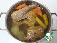 Процедить бульон, вымыть кастрюлю. Грибы отцедить. Жидкость из-под грибов процедить через несколько слоев марли, влить в бульон, добавить отцеженные грибы. Мясо отделить и порезать. |