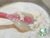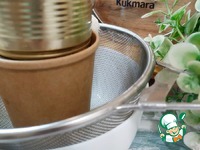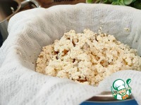 И прямо в марле поставьте под груз и уберите в холодильник на ночь. Я поставила в картонный стаканчик, в дне которого сделала проколы, чтобы стекала лишняя жидкость. |