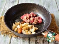 Говядину и грибы порезать на кусочки, выложить в сковороду с добавлением масла. |