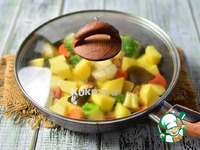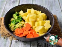 Картофель порезать кубиками, брокколи разделить на соцветия, морковь - кружочками. Выложить овощи в сковороду. |