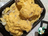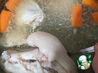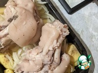 После остывания, выложить ножки в форму на подложку и картофеля кружками, полукольцами лука. Присолить, поперчить, влить половник бульона, в котором варились ножки. |