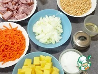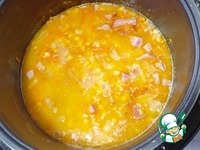 Добавляем в чашу 1 литр воды (горячей), горох и ветчину - Режим «Суп/Тушение» 30 минут. |