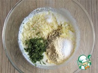 Всыпать муку, разрыхлитель, тертый сыр, рубленный укроп, соль, перец и измельченный чеснок. |