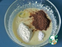 Добавить просеянную муку, какао, разрыхлитель и растительное масло. |