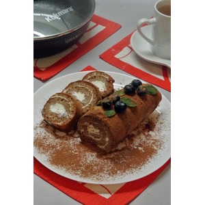 Описание: Очень симпатичный рулет. Готовится быстро и просто. По вкусу очень похож на бисквитный. Выпекала на сковороде 24 см со съемной ручкой, стеклянной крышкой, АП линия "Granit ultra" ТМ KUKMARA.