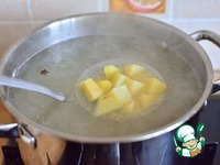 В бульон выложить промытое пшено, картофель, порезанный кубиками. |
