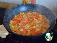 Подготовить зажарку: морковь, лук, помидор, чеснок нарезать мелко, добавить соевый соус и масло, обжарить. |