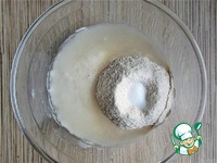 К опаре добавить 125 мл воды, цельнозерновую муку и соль, хорошо перемешать. |