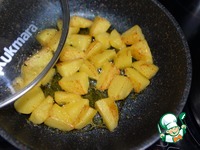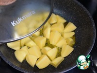 На сильном огне обжариваем картофель до золотистой корочки со всех сторон. Я готовила при закрытой крышке, так как картофель разбрызгивал масло. Убираем картофель на тарелку. Сковороду не моем. |