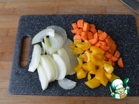 Лук, морковь и перец чистим, режем. Нарезка на ваше усмотрение: кубики, стрелки, полоски, но не крупно и не мелко. |