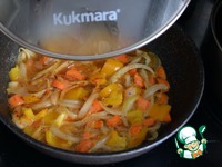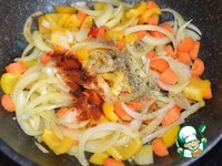 Затем обжариваем морковь (2 минуты на среднем огне), далее перец, также 2 минуты. Добавляем соль, Итальянские травы, перец и паприку, перемешиваем. |