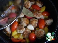 Кладём обжаренные фрикадельки, порезанные пополам помидорки черри, чеснок, лавровый лист. |