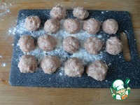 Формуем фрикадельки размером с грецкий орех, кладём на посыпанную мукой доску, чтобы не прилипали. |