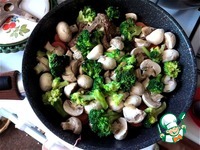 Добавить брокколи и грибы. Не перемешивать. Это блюдо готовится слоями. |
