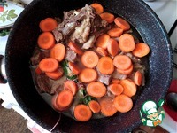 Морковь нарезать произвольно, но крупно. Выложить в сковороду к баранине вместе с букетом гарни. Не мешать. Тушить ещё 1 час. Вот вместе с морковью вы можете положить порезанный пастернак. |