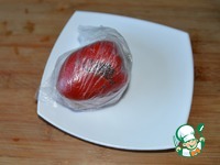 Кладём перец в пакет, отправляем на 1 минуту в микроволновку, даём полежать 10 минут и снимаем кожицу. |