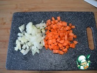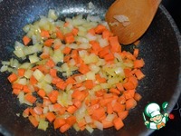 Берём кастрюлю с толстым дном или сотейник. У меня - сковорода с высокими бортами. Нагреваем, наливаем масло, обжариваем лук и морковь на среднем огне 5 минут. |