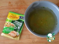 Готовим бульон. У меня - бульон куриный домашний ТМ Роллтон. Разводим бульон кипятком, из расчёта: 1 ч. л. порошка на 500 мл кипятка. В этом рецепте 4 ч. л. на 2 л кипятка. Размешиваем. |