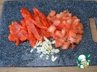 Перец чистим, режем полосками. Помидор ошпариваем, снимаем кожуру, режем мелкими кубиками. Мелко режем чищенный чеснок. |