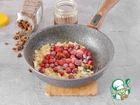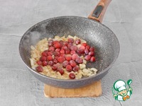 А на вытопившемся жире поджарьте нарезанный мелко лук до лёгкого золотистого цвета. После чего добавьте клюкву. |