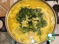 Добавить в кастрюлю плавленный сырок и мелко нарезанную зелень с чесноком, хорошо перемешать. Посолить по вкусу и варить ещё 10 минут. Готово. |