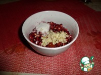 В миску выкладываем зерна граната, измельченный чеснок, соль, сахар, копченую паприку, мускатный орех и растительное масло. |