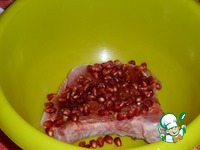 Сковороду ставим на огонь и хорошо разогреваем. Выкладываем в сковороду кусок мяса, очистив его от зерен граната. Обжариваем 5 минут с одной стороны. |
