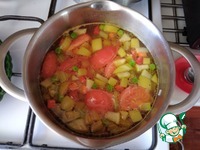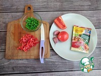 Добавляем бульон. Я добавила 3 ч л, размешала и попробовала на вкус. Бульон солёный, соли дополнительно нам не потребуется. Выкладываем помидор, чеснок и вермишель. Ждём, когда закипит суп. |