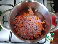 В кипящую воду выкладываем кубики лука и моркови. Даём закипеть и убавляем огонь на минимум. Накрываем крышкой, варим и продолжаем резать следующие овощи. |