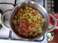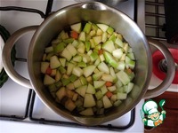Отправляем в кастрюлю. Продолжаем варить всё до готовности овощей и яблока. В общей сложности это всё варится минут 15. |