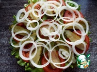 Помидор и лук нарезать кольцами. Огурец полосками или кружочками (как больше нравится). |