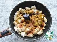 К обжаренному филе добавляю смесь специй, соль и пасту тамаринда. Перемешиваю, чтобы специи обволокли и проникли в каждый кусочек. |