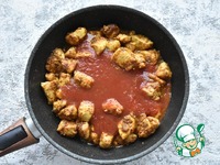 Вливаю томатный соус Пассата. Уменьшаю огонь до среднего уровня, чтобы соус не сильно бурлил. |