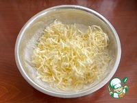 В глубокой миске смешайте муку, сахар, щепотку соли и разрыхлитель. Натрите на крупной терке замороженное сливочное масло и всю массу перетрите в крошку. |