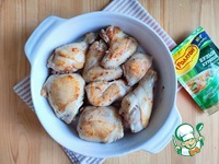 Приготовленной смесью покрыть обжаренные кусочки курицы. Форму отправить в разогретую духовку, запекать блюдо в течение 15-20 мин. Если кусочки большие, время запекания следует увеличить. |