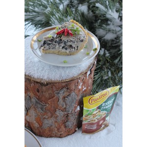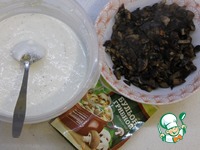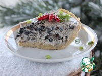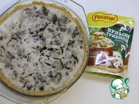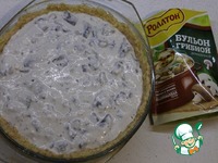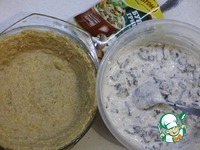 Соединить заливку с остывшими грибами. При помощи ложки выложить основу в смазанную форму для запекания (у меня она диаметром 16 см), разровнять. |