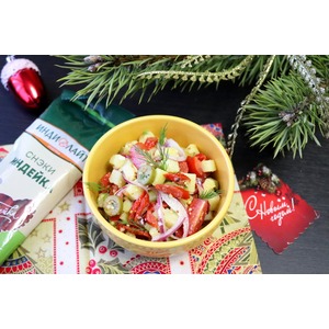 Полить салат приготовленной заправкой и аккуратно перемешать. |