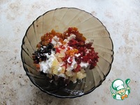 Для начинки смешать творог, вымытые и нарезанные небольшим кусочком сухофрукты, ванильный сахар. Добавление сахара - по вкусу! |