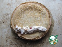 На край блина выложить порцию начинки, свернуть конвертом или трубочкой. |