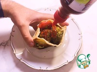 Когда все подготовлено в питу отправляем хумус, овощи, фалафель и поливаем соусами. |