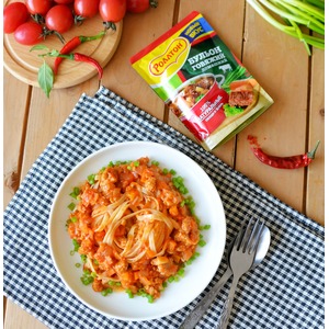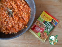 Далее следует посолить, но я советую вам добавить бульон, у меня - "Роллтон", говяжий домашний, он придаст блюду дополнительно вкус и аромат. Перемешиваем и тушим соус на слабом огне 20 минут. |