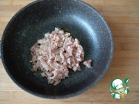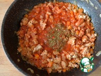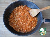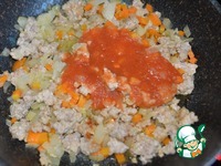 Готовим соус. На горячую сковороду наливаем масло, кладём фарш, у меня - смешанный: свинина и говядина. Обжариваем на среднем огне 5 минут, разбиваем комочки. |